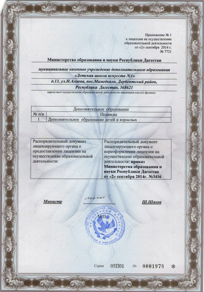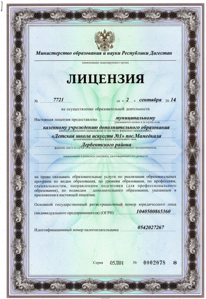 | Полное наименование образовательной организации* | Муниципальное казенное учреждение дополнительного образования «Детская школа искусств №1 пос.Мамедкала |